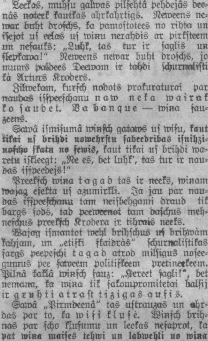 Leeîas, muhşu o/àas pilşehtâ pehdejâs drena* ntftetï ķautkas ahrkahrtigs. ik= ìtfax brcht droşchH, ka pamostotees no rihta un işejot us eŗlas us wiņu nerohdìs crr pirksteem xtn nesauks: „Luihk, tas wr ir saglis uņ sļepkama!" Neweens newar buht droşchs, jo MàUM's paļdees Decwam ir txchdi schurnalisti kà Arrurs Kroders. Ziļmekam, kuŗşch nodots prokuratūrai par rcoirbas isşpeeşchanu n aw neka wairak kosaudet. Vabangue — wiņa şauzeens. Şowâ isnrişumâ wiņşih gataws us misu, kaut tikai us brihdi nowehrstu şabeedribas isnihzinaşcho şkatu no şewiS, kaut tikai us brihoi waretu işkleegt: „Ne es, bet luhk', tas wr ir naudas isşpeedejs!" Preekşch wiņa tagad tas ir neeks, wiņam wajaa, efekta us aznmirkli. Ja jau par naudas īsspeeschanu tam neisbel>gami draud tik bargs sods. tad peenņenat tam daşchus mehneşchus preekşch Krodera ir tihrnis neeks. Vajag ismantot mehļ brihschus vi brihwàm şahjam, un „etişki staioràs" schurihalistikas sargs peepeschi tagad atrod miksigus noseegunrus pee şaweem politişkeem pretineekeem. 'Pilna kakla miņsch sauz: „Aereet sagli!*, bet nemana, ta wiņa tik sakompromitētai balsij ir gruhti atrast tizigas ausis. Şawâ „Pirmdeenâ" tas ustranzas un shrdas par to, ka w i s i k ļ v ş è. Wiņsch brihnas par scho klusumu un leckas nesaprot, ka pat wiņa maises tehwi un labwehti no wiņa
