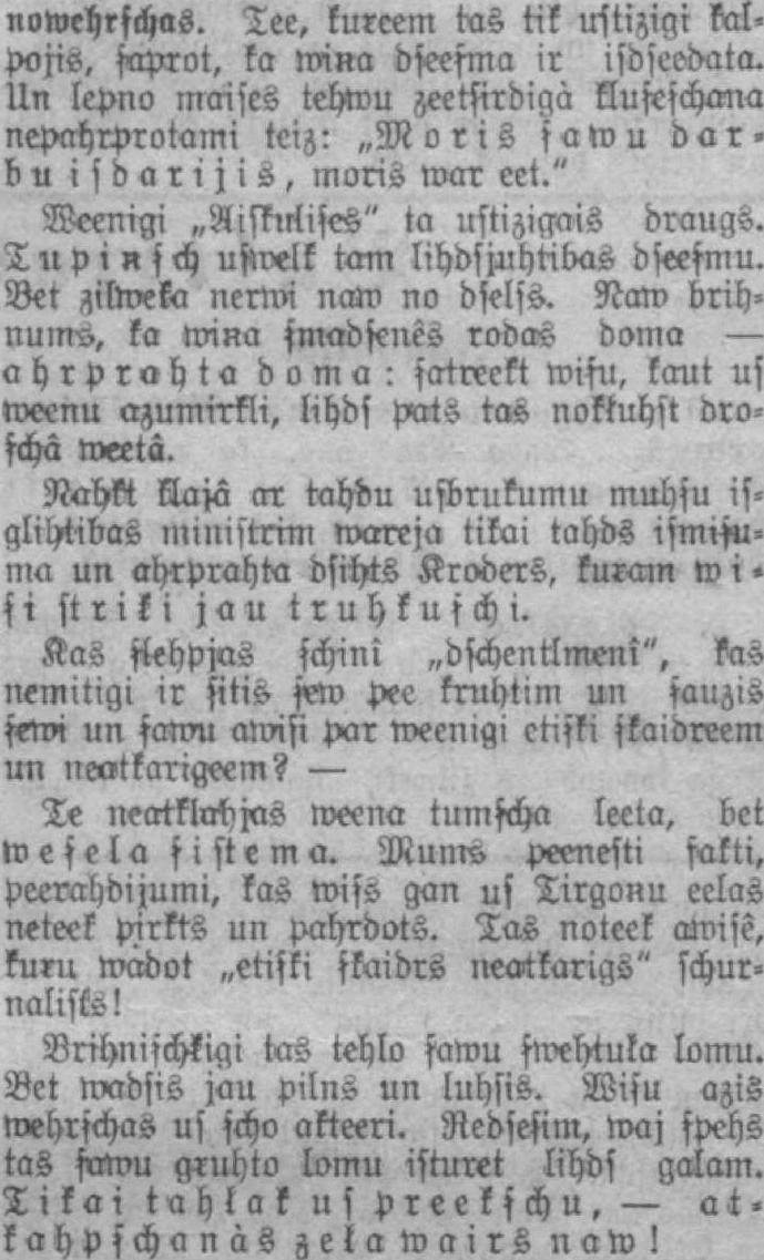 nowehrşchas. Tee, kureem tas tik uşiizigi kalpojis, saprot, ka miņa dseesma ir isdscodata. Un lepno maises tehwu zeetşirdigà kluşeşchmm nepahrprotami tciz: „Moris samu barbu isdarijis, moris war eet." Weenigi «Aiskirlises" ta ustizigais draugs. Tupiņsch ustvelk tam lihdsjnhribas dseesmu. Bet ziļweka nerwi naw no dselss. Naw brihnums, ka wiņa smadsenès rodas doma — ahrprah ta doma: satreekt wişu, kaut us roeenu azumirkli, lihds pats tas nokļuhst droschâ weetâ. NaW klaja ar tahdu usbrukumu muhsu isglihşibas ministrim tvareja tikai tahds ismişuma un ah-rprahta dsihts Kroders, kuŗain w i * si striķi jau truhkuschi. Kas sļehpjas schini „dschentlmeni", tos nemitigi ir sitis sew pee kruhtim un sauzis şemi un şamu awisi par meenigi ētiski skaidreem un neotkarigeem? — Te neatklrchjas weena tumscha leeta, bet weşela sistēma. Mums peenesti sākti, peerahdijumi, kas wişs gan us Tirgoņu eelas neteek pirkts un pahrdots. Tas noteek awisê, kurn madot „etiskj skaidrs neatkarigs" schurnalisks! Brihnischķigi tas tehlo şawu smehtuļa lomu. Bet madsis jau pilns un luhsis. Wişu azis wehrşchas us scho akteeri. Redseşim, waj spehs tas samu aruhto lomu isturet lihds galam. Tikai tahļak us preekschu, — aikahpşcha nàs zeļa wairs naw!