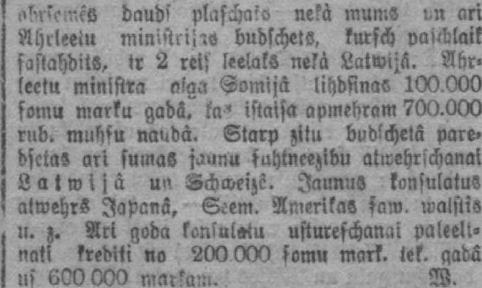 î »brşeņM daudş plaschaşo nekà mums m ari Ahrleetu min'.'tni-is budschetS, kmşch vaiļblaik sastahditS, tr 2 rets leelaks nefà Latwijâ. Ahr. leetu miniftra aiga Şomijâ lihdfinas 100.000 somu marku gadā. ka" işiaìşa apmehram 700.000 rub. muhsu nauda. Starp zitu bvdkchetā pare» dsctas ari fumaS jaunu şuhtneezibu ativehrschanai Latwìjà un Şchweizê. Jaunus konsulātus ! atwehrS Japānā, Scem. Amerikas şaw. walstîs . v. z. Ari goda konlula-tu ustureşchan.u paļeeltnatl krediti no 200 000 şomu mark. tek. gadā ! us 600 000 markam. W.