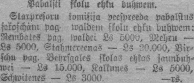 Pabalsti skolu ehku buhmem. Starpresoru komisija peespreeda pabalstīts şekoşchmìt pag- maldem skolu chtu duhwem: Neiubates pag. ivaldei Ls bOOv), Mehru — Ls 5000, Ştahnlcreenas — Ls :'O.OOO, Birschu pag. Benrsgales skola? ehkas jaunbndwei — Ls 15.000, Kalkūnes — LS 5000, Sck)witenes — Ls 3000. —rs.