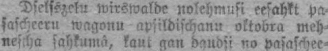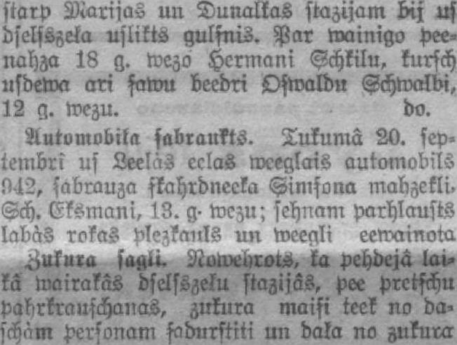 starp Marijas un Dunalkas stazijam bij us oselsszeļa uslikts gulsnis. Par roainigo peenahza 18 g. mezo Hermani Şchkilu, kursch usdewa ari şawu beedri Oşwaldu Şchwêi, 12 g. Mezu. do. Automobiļa sabraukts. Tukumā 20. sep. tembri us Leelàs eclas meeglais automobils 9-12, şabrauza şkahrdnecka mabzekli. Şch. Eksmani, 13. g- mežu; sehnam parhlausts labàs rokas Plezkaills un Meeali eemainota .àa Nomelots, la pehdĢ tmkâ Mairakâs dseļsszeļu stazijas, pee pretschu pabrkrauschanas, zukura maisi teek no daschàm personām sadnrstiti un daļa no zukura