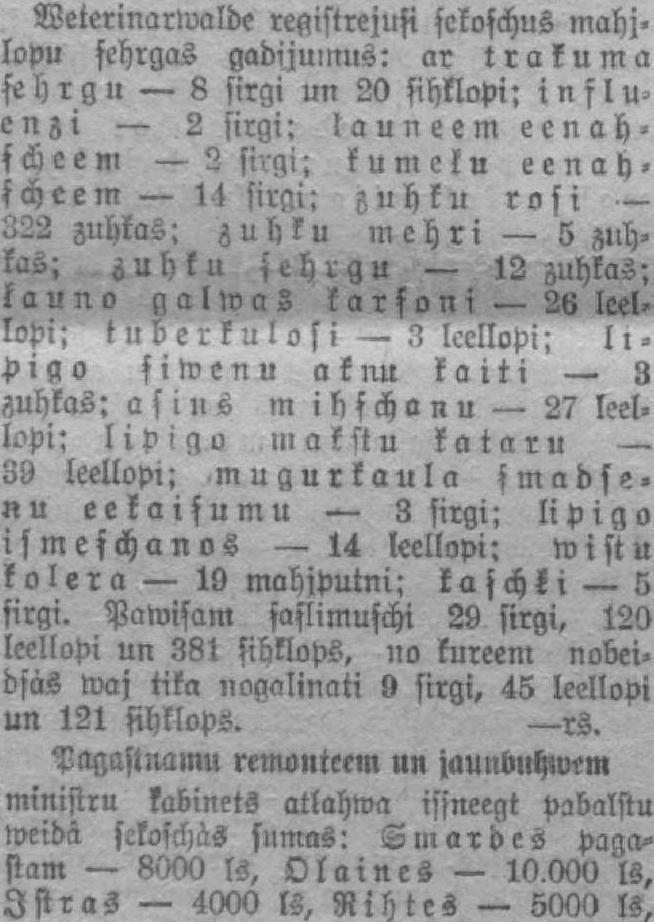 Weterinarwalde reģistrējusi şekoşchus mahj. lopu şehrgas gadījumus: ar trakuma şehrgu — 8 sirgi un 20 şihklopi; influe n z i — 2 sirgi; ļauneem eenahşcSeem — 2 sirgi; kumeļu eenah. şcheem — 14 sirgi: ôuhku rosi — 022 zuhkas: zuhku mehri — 5 zlchka-.; zuhku ş c h r g v — 12 zuhkas; ļauno galMaZ karsoni — 2L leellopi: ş !l o c r k v l o s i — .1 lccllopi: l l Pigo şiwenu aknu kaiti — 3 zuhkas: asins m ihschanu — 27 leellopi; lipigo makstu kataru — 89 leellopi; mugurkaula smadse. ņu eekaisumu — 3 sirgi; lipigo ismeschanos — 14 leellopi: mistu kolera — 19 mahjputni; kaschķi — 5 sirgi. Pamisam saslimuschi 29 sirgi, 120 leellopi un 381 sihklops, no kureem nobeidsàs Maj tika nogalināti 9 sirgi, 45 leellopi un 121 şihklops. —rs. Pagastnamu remonteem un jaunlmhwem ministru kabinets atļahma issneegt pabalstu weidâ şckoschàs sumas: Siuardes pagastam — 8000 ls. Olaines — 10.000 ls, Jstras — 4000 ls, Rihtes — 5000 ls.