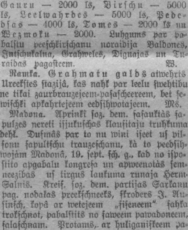 Madona. Apriņķī soc. dem. sasauktās sapulces nereti izjukušas klausītāju trūkuma dēļ. Dusmās par to nu viņi ķeras uz pilsoņu sapulcību traucēšanu, kā to piedzīvojām Madonā, 19. sept. š. g., kad no izpostīto apgabalu kongresa un apvienotās zemniecības uz tirgus laukuma runāja Herm. Salnis. Kreis. soc. dem. partijas Šarkaņu pag. nodaļas priekšnieks, šuvējs I. Auziņš, kopā ar vietējiem “siseņiem” sāka trokšņot, pabalstīts no saviem pavadoņiem, salašņām. Protams, ar huligāniskām paņēmieniem Auziņš Salna runas iespaidu klausītājos nespēja mazināt, bet gan drīzāk panāca pretējo, jo lieku reizi pierādīja, uz kādu piekritēju “masām” soc. dem. balstās un ko mēs varētu sagaidīt, ja šo elementu priekšstāvji nāktu pārsvarā nākošās Saeimas sastāvā. C.