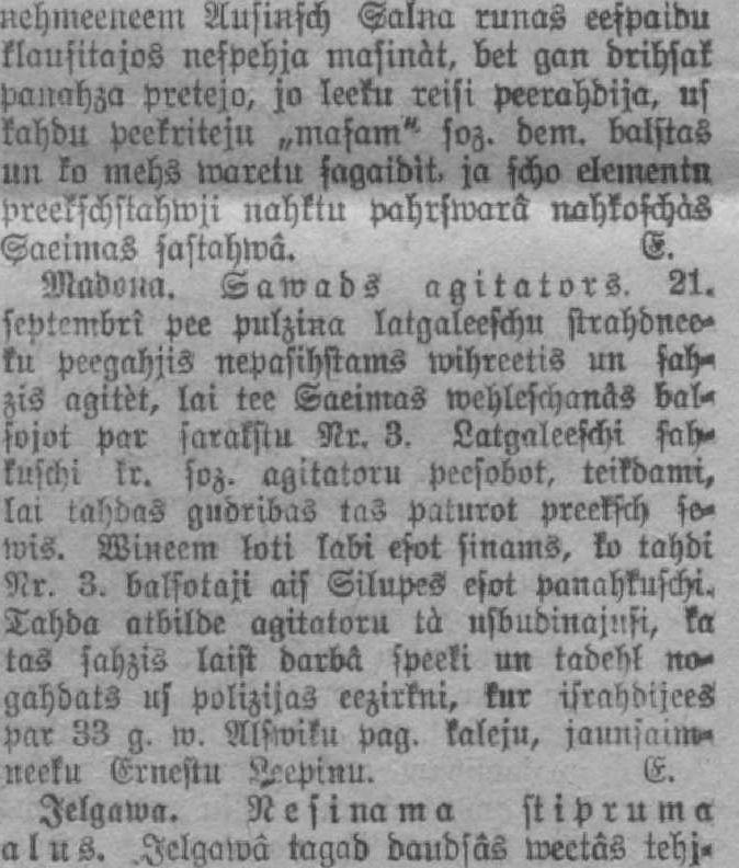 Madona. Savāds aģitators. 21. septembrī pie pulciņa latgaliešu strādnieku piegājis nepazīstams vīrietis un sācis aģitēt, lai tie Saeimas vēlēšanās balsotu par sarakstu Nr. 3. Latgalieši šādu lēr. soc. aģitatoru piesoduši, teikdami, lai tādas gudrības tas paturot priekš sevis. Viņiem ļoti labi esot zināms, ko tādi Nr. 3 balsotāji aiz Sīlupes esot panākuši. Tādu atbildi aģitatoru tā uzbudinājusi, ka tas sācis laist darbā spēku un tādēļ nogādāts uz policijas iecirkni, kur izrādījies par 33 g. v. Mišuliņu pag. kalēju, jaunsaimnieku Ernestu Lepiņu. E.