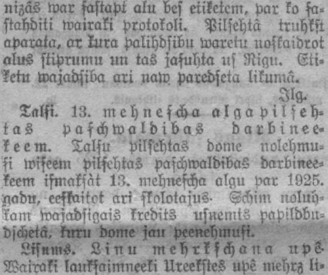 nizâs Mar sastapt alu bes etiķetēm, par ko sastahditi Mairaki protokoli. Pilsehta truhkst aparāta, ar kura palihdsibu Maretu noskaidrot alus stiprumu un tas jasuhta ns ffiiŗnt. Cšii» letu wajadşiba ari naw paredseta likumā. Jlg. Talsi. 13. mehnescha alga pil seh» tas paşchwaldibas darbi neekeem. Talsu pilscbtas dome nolehmusi Miseem pilsehtas paşchwaldibaS darbineekeem ifmaksàt 13. mehnescha algu par 1925. nadn, eeskaitot ari skolotājus- Sebim uolub' ì'am Wajadsioais kreditē usueuii' papisdbudschetâ, krrnl dome jau peeņehmusi. Lisņms. Linu mehrkschana upZVairāki lauksaimneeki Ureekstes upē mehrz li