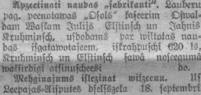 Apzēģināti naudas “fabrikanti”. Lauderu pag. pienotavas “Osols” kasierim Ošvaldam Vaškam Jūlijs Elstiņš un Jānis Kruhmiņš, uzdodams par viltotas naudas izgatavotājiem, izkrāpuši 620 ls. Kruhmiņš un Elstiņš savā noziegumā atklātīgi atzinušies. do.