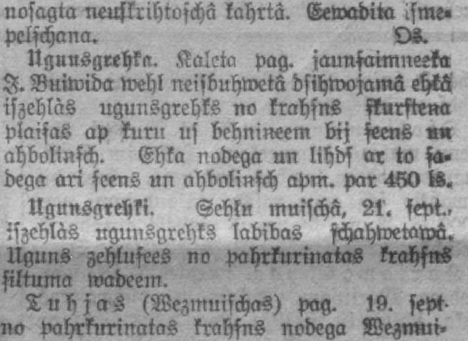 nosagta neuşirihtoşchâ kahrtâ. Eewadita ìsme» petschana. Os. Nguusgrehka. Kalcta pag. jaunşaimneêķa I. àiroida wehl neisbuhwetâ dsihwojamâ ehkâ iszehlàs ugunsgrehks no krahsns şķurfteņa plaisas ap kuni uf behniņeem bij şeens »ņ ahbolinşcb. Ehka nodega nn lihds ar to şadega ari şeens un abboliņşch apm. par 460 tS. Ugunsgrehki. Şebļņ muşschâ, 21. sept., iszeblàs ugunsgrehks labibas fchahwetawâ. Uguns Aehtuşces no pahrkurinatas krechsns şiltuma wadeem. Tubjas (Wezmuischas) pag. 19. sept na Pahrkirrinatas krahsns nodega Mezmui»