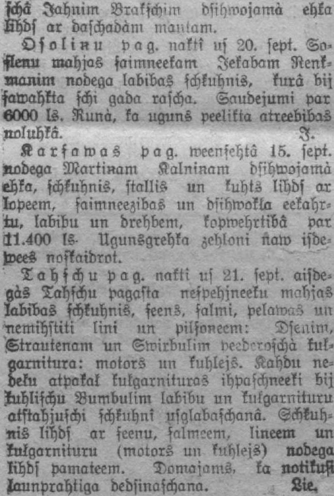 scha Jahnim Brak schim ehka Shds ar daschadàm man tam. Osoliņu pag. nakts us 20. sept. Soşlenu mahjas soimneekam Jēkabam Renkmanun nodega labibas schķuhnis, kurā bij şawahkta schi gada rascha. Saudejumi par «000 ls. Nunà. ka uguns peelikta atreebibas Zwluhkâ. I. Karşawas pag. weenşehtâ 15. sept. Nodega Mārtiņam Kalniņam dsihwojarnà ehka, schķuhnis, stallis un kuhts lihds ar lopeem, saimneezibas un diihmokļa eekahrtu, labibu un drehbem, kopmehrtiba Par lļl.Ş ls- Ugunsgrehka zehloni tìaw isdejvees noskaidrot. Tahschu pag. nakti ns 21. sept. aisoegàs Tahschu pagaşia neşpehjneeku mabias labibas schķuhnis, seens. salmi, pelamas un itemihstiti lini un pilsoņeem: Dseuim, Ktrantenam un Swirbulim peederoàa kuļoarnitura: motors un kuhlejs. Kahdu neoeķu atpakaļ kuļgarnituras ihpaschneeki bij Ztuhlischu Bumbulim labibu un kul garnitūru atstahjuşchi şchķuhn? usglabaşchanâ. iris lihds ar seenu, salmoem, lineem un kuļgarnituru (motors un ktchlejs) nodega ļihds pamateem. Doma jonis, ka notikusi jlaunprahtiga dedsinaschana. Lie.