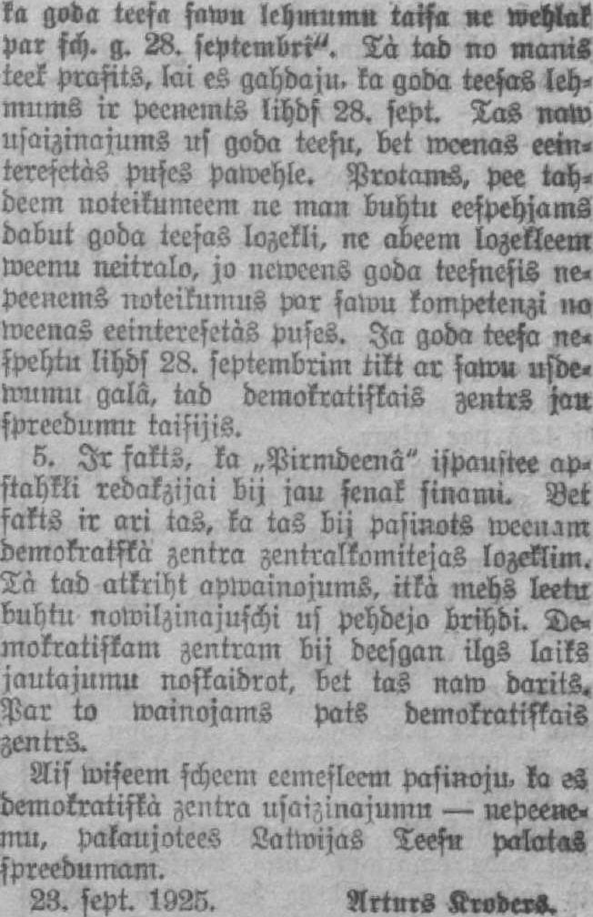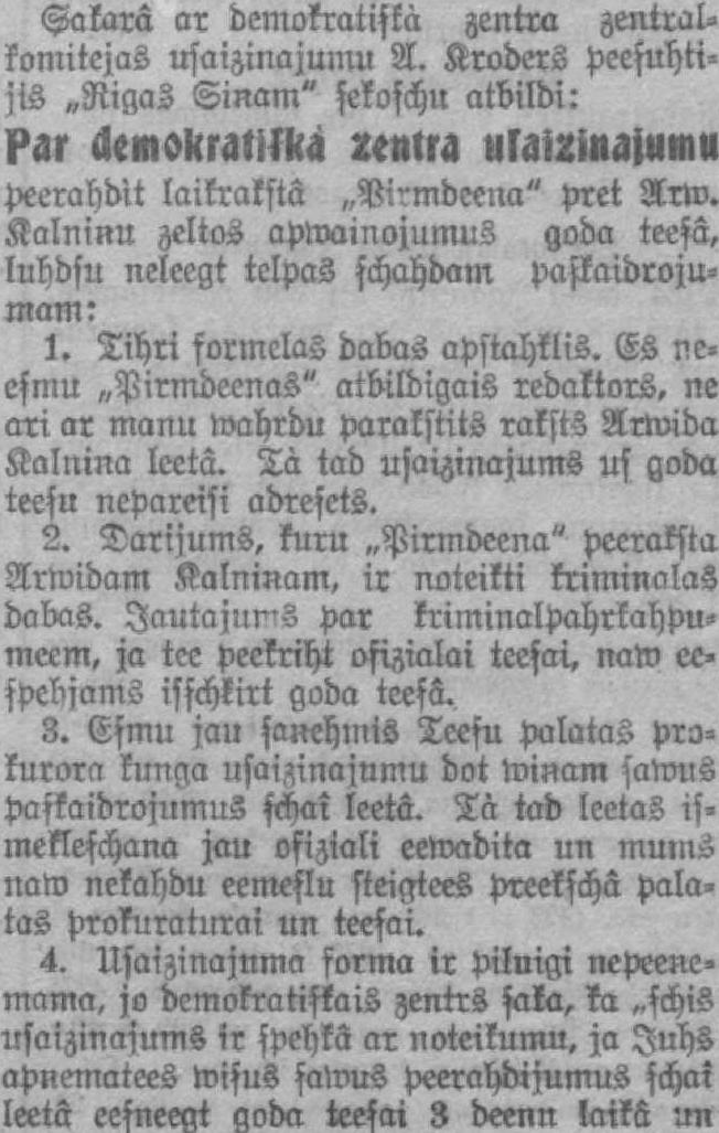 Şakarâ ar demokrātiska zentra zentralkomitejas usaizinajumu A. Kroders peesuhtijis „Rigas Siņam" sekoschu atbildi: Par àolilâMka zmu ula,ŗiņajuma peerahdìt laikrakstā „Pirmdeena" pret Arw. Kalniņu zeltos apmainojumus goda teeşâ, luhdsu neleegt telpas schahdam paskaidrojumam: 1. Tihri formelas dabas apstahklis. Es neesmu ~Pirmdeenas" atbildīgais redaktors, ne ari ar manu wahrdu parakstits raksts Arroida Kalniņa leetâ. Tà tad usaizinajums us goda teesu nepareisi adresēts. 2. Darijums, kuru „Pirmdeena" peeraksta Arwidam Kalniņam, ir noteikti kriminālas dabas. Jautājums par kriminalpahrkahpumccm, ja tee peekriht ofizialai teesai, naw eespebjams isschķirt goda teeşâ. 3. Esmu jau saņehmis Teesu palātas prokurora kunga usaizinajumu dot Miņam samus paskaidrojumus şchaî leetâ. Tà tad leetas ismekleschana jau osiziali eemadita un mums nam nekahdu eemeslu steigtees preekşchâ pālatas prokuratūrai un teesai. 4. Usaizinajuma forma ir pilnigi nepeeņcmama, jo demokrātiskais zentrs saka, ka „schis usaizinajums ir spehka ar noteikumu, ja Juhs apņematees wişus şawus peerahdijumus şchaî leetâ eesneegt goda teesai 8 deerm laikā un
