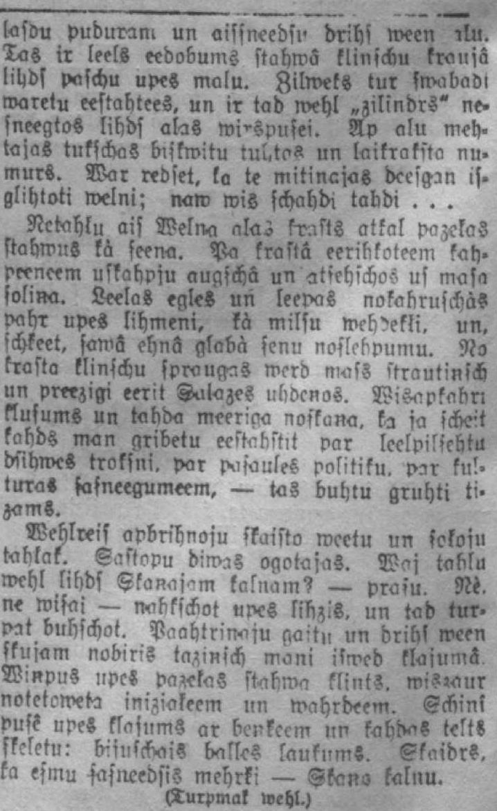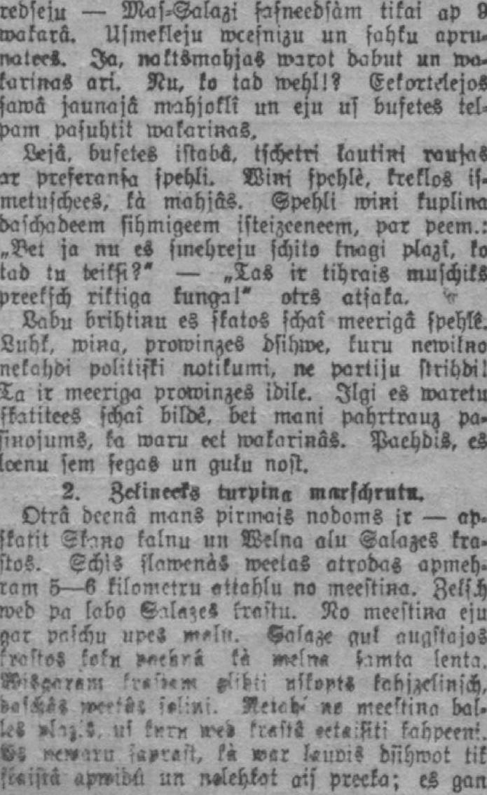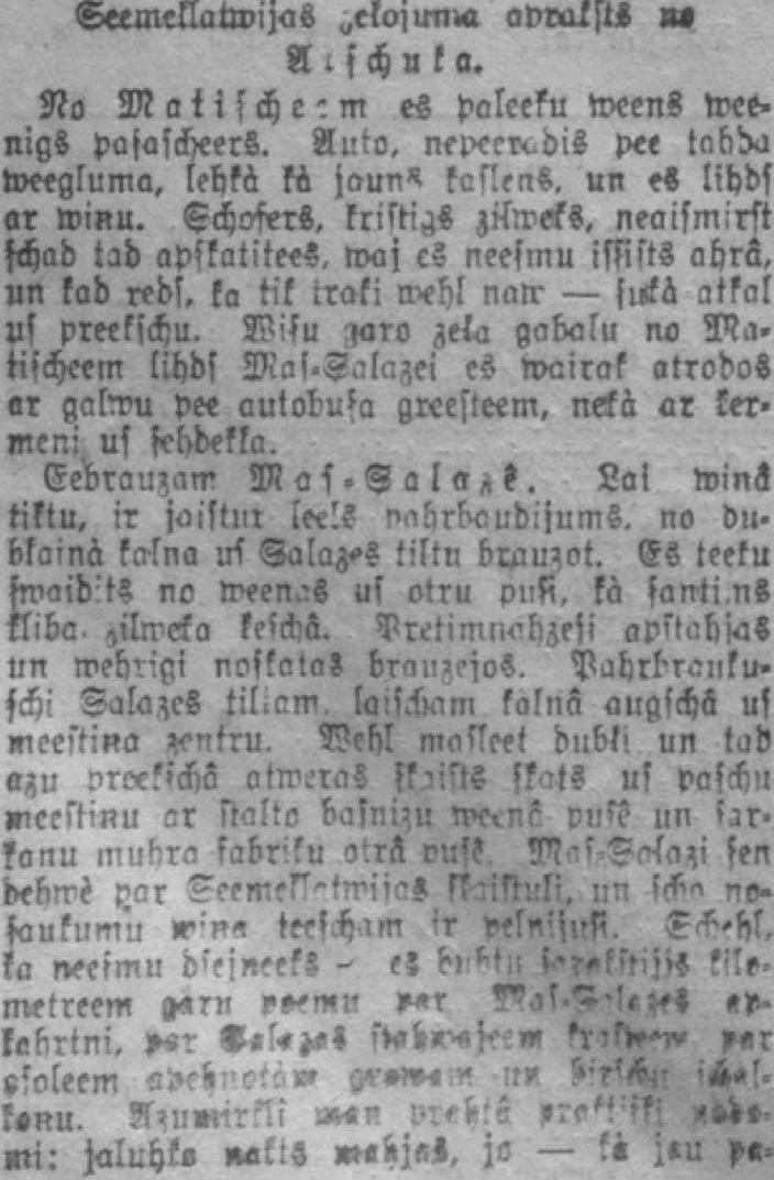 SeemcllatwijaS avvalstķ us A şchuka. No Matische: m es poleeku weens wee> nigs paşascheerS. Auto, nepeerudis pee tabda weegluma, lehkà kà kaNeas. un es lihds ar wiņu. Şchoşers. kristies zàeks. neaismirst şchad tad apskatitees. waj es neesmu isşists ahrâ, un kad reds, ka tik traki wehl naļr — sukà atkal uş preekschu. Z?!şu iaro zeļa gabalu no ??a. tişcheem lihds Mas-Zalazei es wairak atrodos «r galn?u pee autobusa greesteem, nekà ar kermcn.' us şebdekka. Eebrau?am Lai winâ tiktu, ir jaistnl leels nabrbaudijums. no dubļainà kalna uş Şalaz-s tiltu braucot. Es teeku şwaid'ts no meen.:s us otru pnft, kà şanti.ns kliba- lifrref'a FefcbČi. apstahjas nn weh'.im' noskata? briuzejos. Pahrbraliku» f.-fv ŞalazeS tiliam. laisàm kalnā augschâ us meestiņa vntru. Vcbl ma'leet dubļi un tad azu nrsekichâ atmēros skaists skats us paschu mētriņu ar stalto puş? un ht' fonu muhro fabriku otrā vusķ. sen debmè r nosaukumu teescham ir pelnîsuşi. sş-hl. ka neeşmu d'>sņeeks es t>wf?tiî>* ?'e metreem ņtrv rrmv. «p-kabrtni, »«r Vāķķti i*i*y*ŗttm 'x-J**w ftr sşoleem apehnoto» qv**m * uv *;ft%. iá*l. ksņu. ««« mW ir*H.:m *it* mi: jaluhk- ņatlS »«i>j«Z. jo — ?« zau p«.