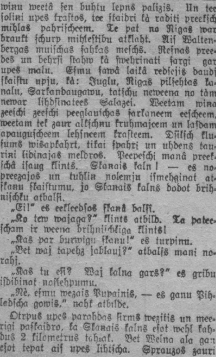 minu weetâ sen buhtu lepnS palizis. Un tet soliņi upes krastos. t« skaidri kà raditi preekşch mihlas pabrişchoem. Te pat no N'gas war braukt şchurp atklaht. Nis Walten. bergaS muischas şahkas meschs. ReşnaS prec. deS un Mirsi stahw kà fwebrinati sargi gar upes malu. Esmu sawâ loikâ rrbfoļi* dauds skaistu upiu. kà: yuglu. RigzK pilşehtas îa. naln, Şarkandauaawu. tatşchu neweena no tàm newar libdunateeS Ģalazei. Weetam wiņa zeeşchi zeeşchi peeglauşchas şarkaneem eescheem. weetam tek zaur alkşchņu krubmajcem un lasdam apauguşcheem lehsneem trasteem. Dsîksch kluşumS wisapkahrt. tikai şpahrj un uhdens tauriņi lidinājās meldros. Peepeschj manâ preek. şchâ isaug klints. Skaņais kaln l — es nopreezajoS un ruMiw nolemju ismehfiinat at. skaņu skaistumu, jo ŞkaņaiS kalns dodot brih. nischķu atbalsi. .Ci!" es eekleedsos şşaņâ balss. tew wajaaa?şş klint» atbild. Ta patee. scham rr weena brihni'H/!aa klints! „Ka§ par bunvign skanu\" es turpinu. ~Vet rvaj tapehz jablauj?ķ atbalss mani no. rahj. .KaS tu Ģ Waj kalna garS?" es gribu isdibinat noilebpumu. *9?è, esmu wezaiS VuPainiS, — es ganu Pih. ledscha gowiS/ nahk atbilde. OtrpuS upe? parabdas şîrms wezitis un mcc. r,qi paskaidro, ka Ckaņais kalns esot wchl kah. duS 2 kilometrus tch»ak. Bet Velna ala aai esot tepat ais upeS ltbtşcha. ŞprauzoS zauri