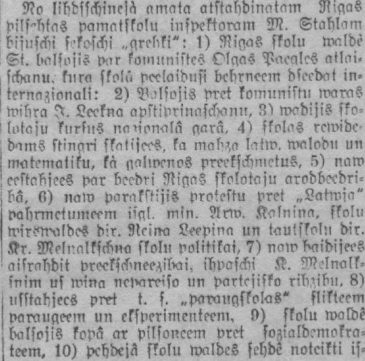 No libdsschinesà amata atstabdinatam NigaS pilsētas pamatskolu inspektoram M. 'bijuşel'i sekoşchî ..grebki": 1) NigaS skolu maldè Iķt. balsojis p-ar kounlnistes Olgas Paeales atlai. , sctņinu. kura skolû peelaidusi bebrneem dşeedat m'' terna-ionali: 2) B 'lşojis pret komunistu maras î Mibra Leekņa 31 ļ-oadijis sko> lataju klirlus nanonalâ garâ. 4) şkolas renx'de , dams stingri skatījos, ka latw. nxilodu un 'matemātiku, kà galloenos preeks(-sm,?tus. 5) nam leestabsees par nccbri Nigas skolotāju arodboedrijbâ. fl) nam parakstījis protestu pret ..Latwja" pobrmetļfmeem i'al. min. Anv. Kalniņa, skolu d:r. 9te!ņa Leepina un tauiskolu dir. Kr. Melnaļksebņa skolu politikai. 7) nam şiaidişei's ailrabdit ibpaşmi K. ?7?'lnalksnim us miņa net'areiso un partejisko rib'ibu. 8) usstabjecs pret t. s. ..paraugskolas- slikteem paraugeem un cksperimenteeni, 9) skolu maldê lxilsojis kopā ar Pilsoņeem pret teem, 10) Pcbdejâ skolu Maldes şchdê noteikti is