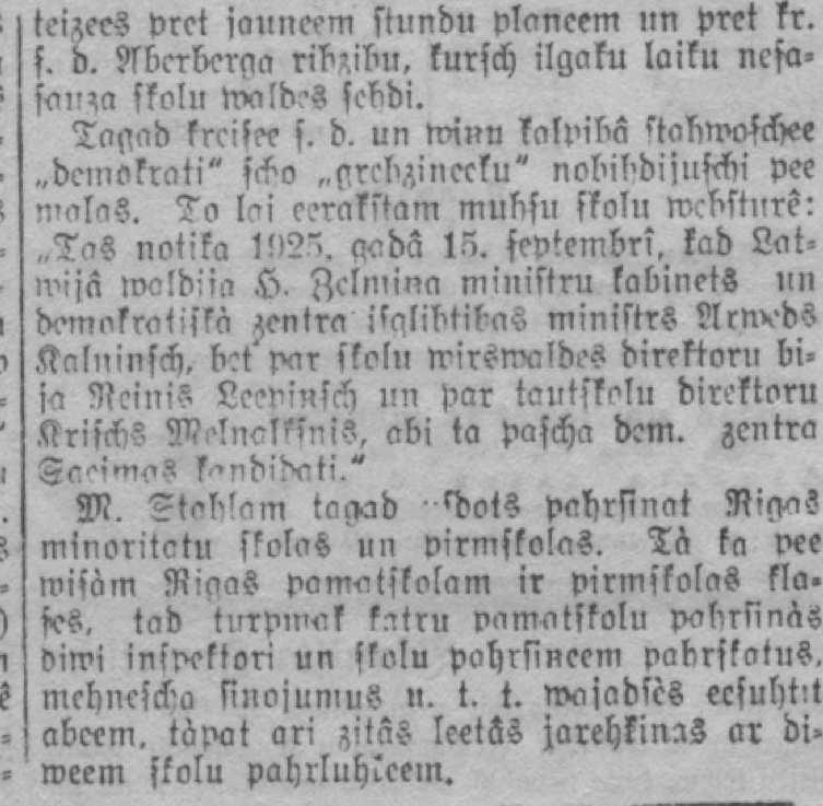 Tagad kreisie s. d. un viņu talībā stāvošie „demokrāti” šo „grēksnieku” nobīdījuši pie malas. To lai ierakstām mūsu skolu vēsturē: „Tas notika 1925. gada 15. septembrī, kad Latvijā valdīja H. Zelmiņa ministru kabinets un Demokrātiskā centra izglītības ministrs Arveds Kalniņš, bet par skolu virsvaldes direktoru bija Reinis Lejiņš un par tautskolu direktoru Krišs Melnalksnis, abi tā paša dem. centra Saeimas kandidāti.”